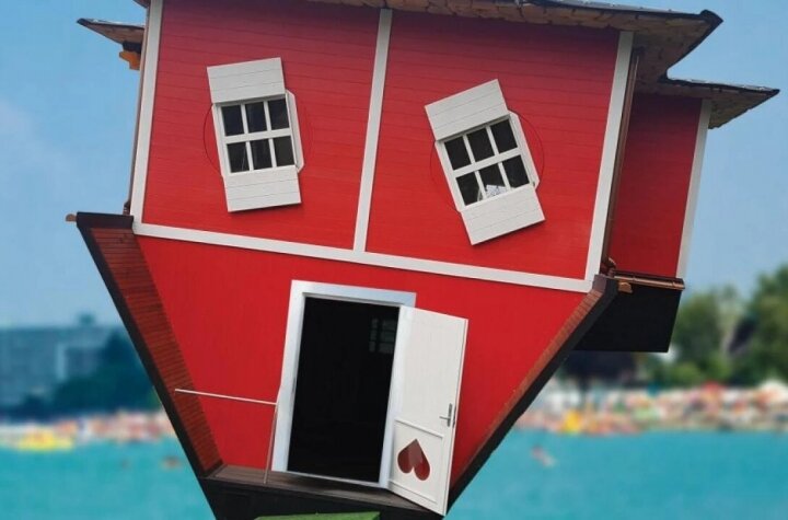 Das Umgekehrte Haus von Siófok steht auf der Spitze des Hügels im Stadtteil Széplak, an der Kreuzung der Straße 1. Mai und der Hauptstraße 7. Es bietet ein unvergessliches Erlebnis für Kinder jeden Alters, insbesondere für jene, die gerne mit der Schwerkraft spielen.